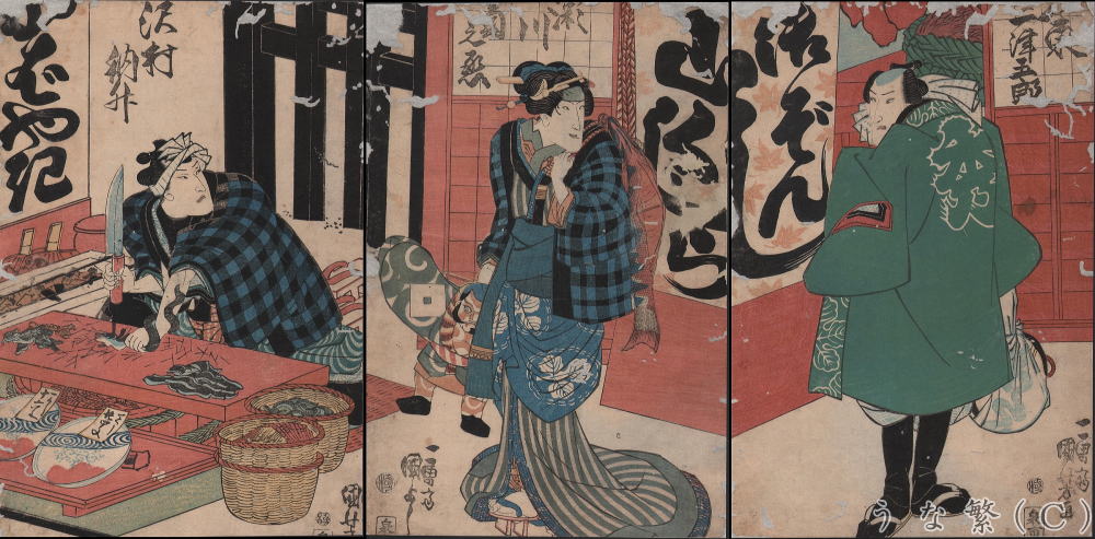 左端の初代沢村訥升がうなぎを割いている