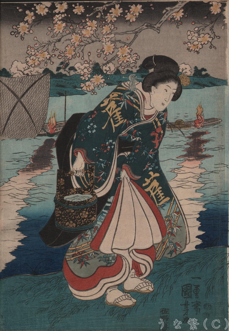 女性が手にしている手桶には四つ手網でとった白魚がはいっているのかもしれません