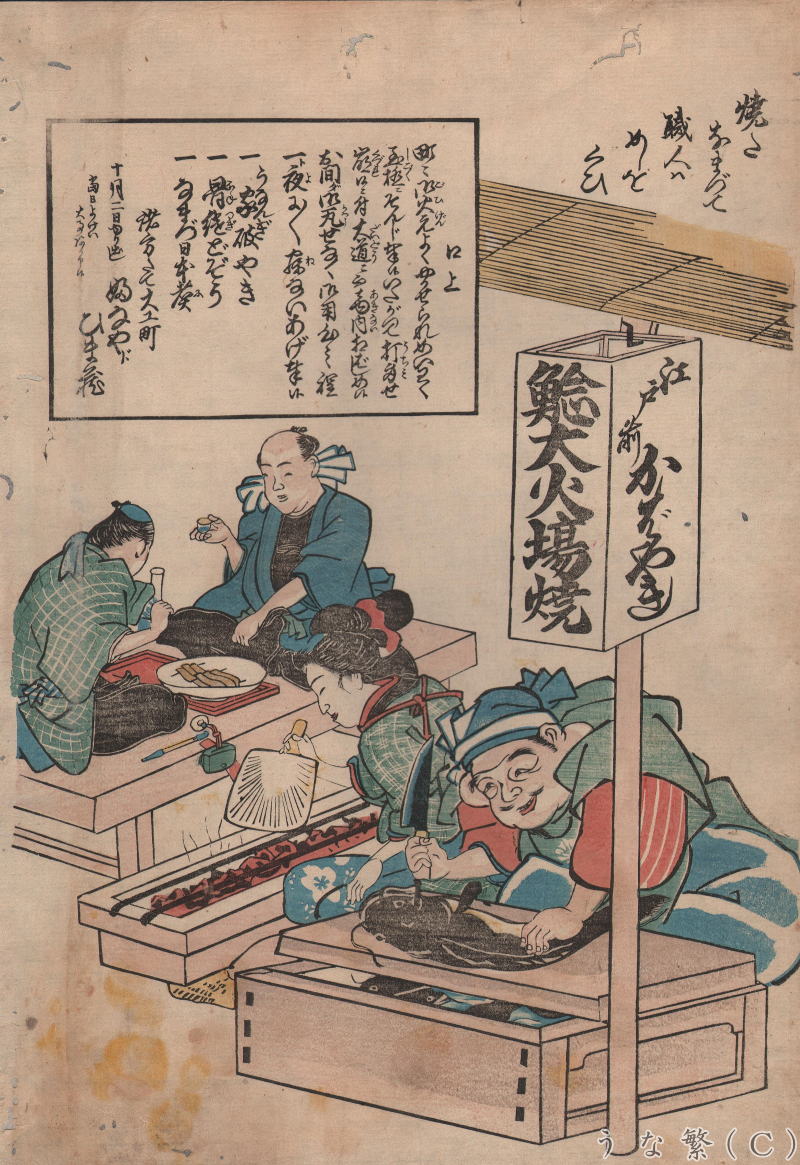 | 鯰の他にも「うなぎ」「どじょう」が売られているのがわかり 当時の蒲焼屋の中では大衆的な店の絵になります 鯰絵は確認されているだけで250点以上で その多くは安政の大地震の年に発行されたと考えられています 大地震後の大火災、その後の復旧による建設関係の好景気などを 風刺して「大火場焼」「うなんぎ(難儀)家破焼」と当て字を当てたり ナマズを調理する地震封じの神様 その蒲焼を食べているのは好景気の大工さんなど 時代を描写している作品です 当時の浮世絵は幕府の倹約令により規制され検閲を受けます そのため鯰絵のほぼすべてが無届けの不法出版で取締まりを逃れるためにわざと 作者、画工、版元などの署名を書いておりません |