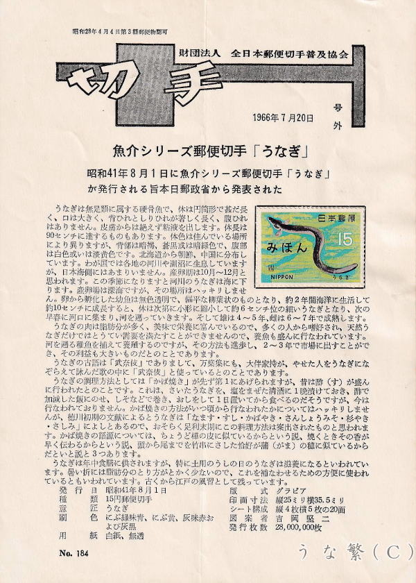 1966年8月1日発行ウナギ切手とFDC・MC