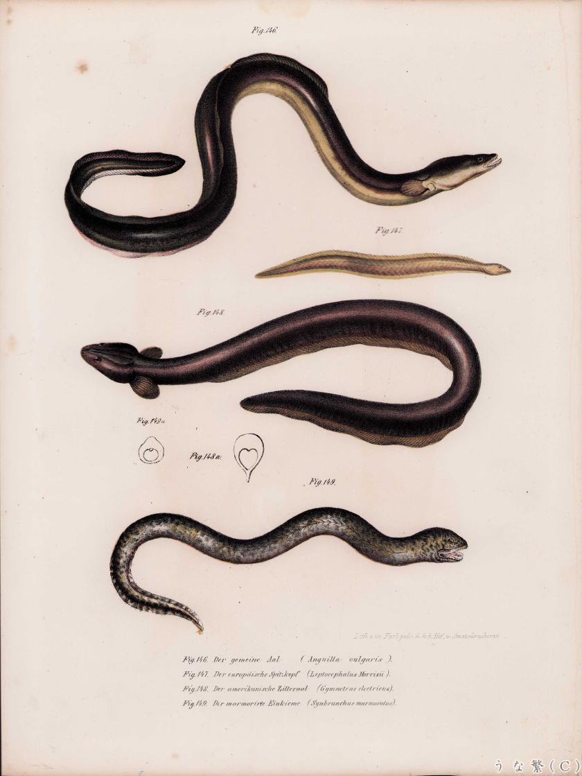 ウナギ類の形態や内部構造を示すため、断面図も描かれています